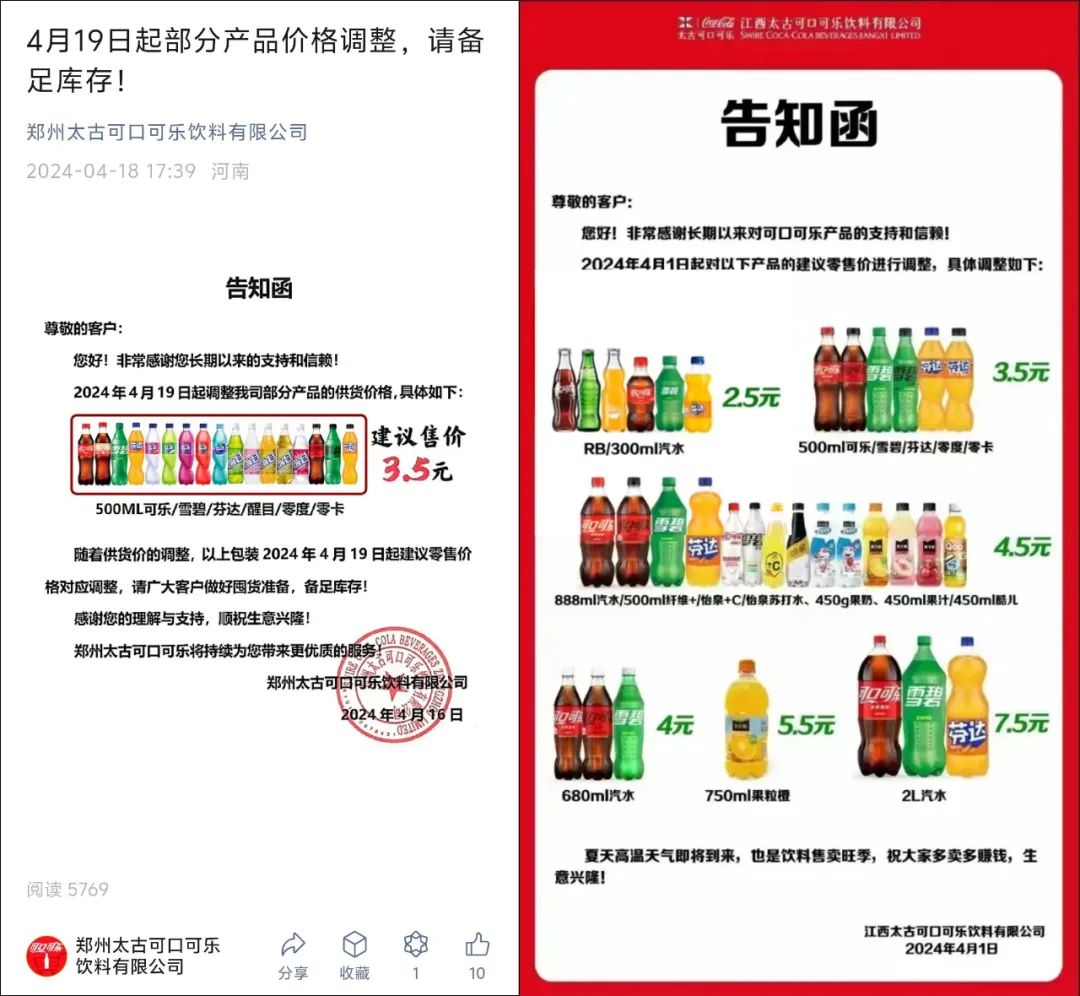 6月即刻完毕,饮料销售正值一年中的“淡季”。此时,距离可口可乐颁布颁发调价已颠终去一个多月了。可口可乐实的跌价了吗? 4月初,各商家跌价的步伐并纷比方致,大多呈不雅张望态度,不敢领涨干犯客户。6月底,食业家从河北、湖北、江西、河南等多个地区的经销商和零售商办理解到,3.5元/瓶的可口可乐曾经初阶传导至末端门店及餐饮店。就目前真地走访状况来看,跌价函发布一个月后,3.5元/瓶的可口可乐曾经逐步笼罩末端门店。 “之前的库存卖完了,新进的货曾经跌价,所以零售价也随着涨了。”石家庄一批发商对食业家默示。另外,也有渠道商向食业家走漏,相关企业正正在同步停行库存调解,以确保跌价战略得以有效执止。 据中粮可口可乐华中饮料有限公司发布的下市通知函,该公司已决议进止供应888ml规格的可乐、雪碧、芬达产品,并停行下市锁码收配。